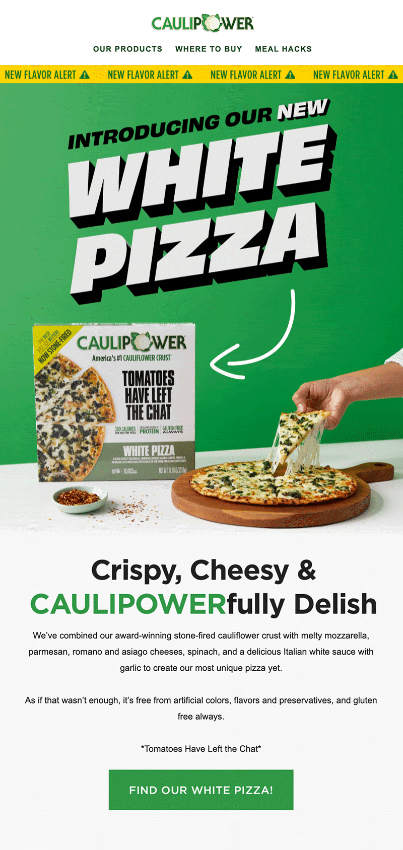 This was a new type of email concept: highlighting recipes that fans could make at home. I needed to stick to the main CAULIPOWER branding and use existing lifestyle photography. I kept to a green and yellow palette and aimed to pair the lifestyle photos with their copy in a way that would keep the email length to a minimum.