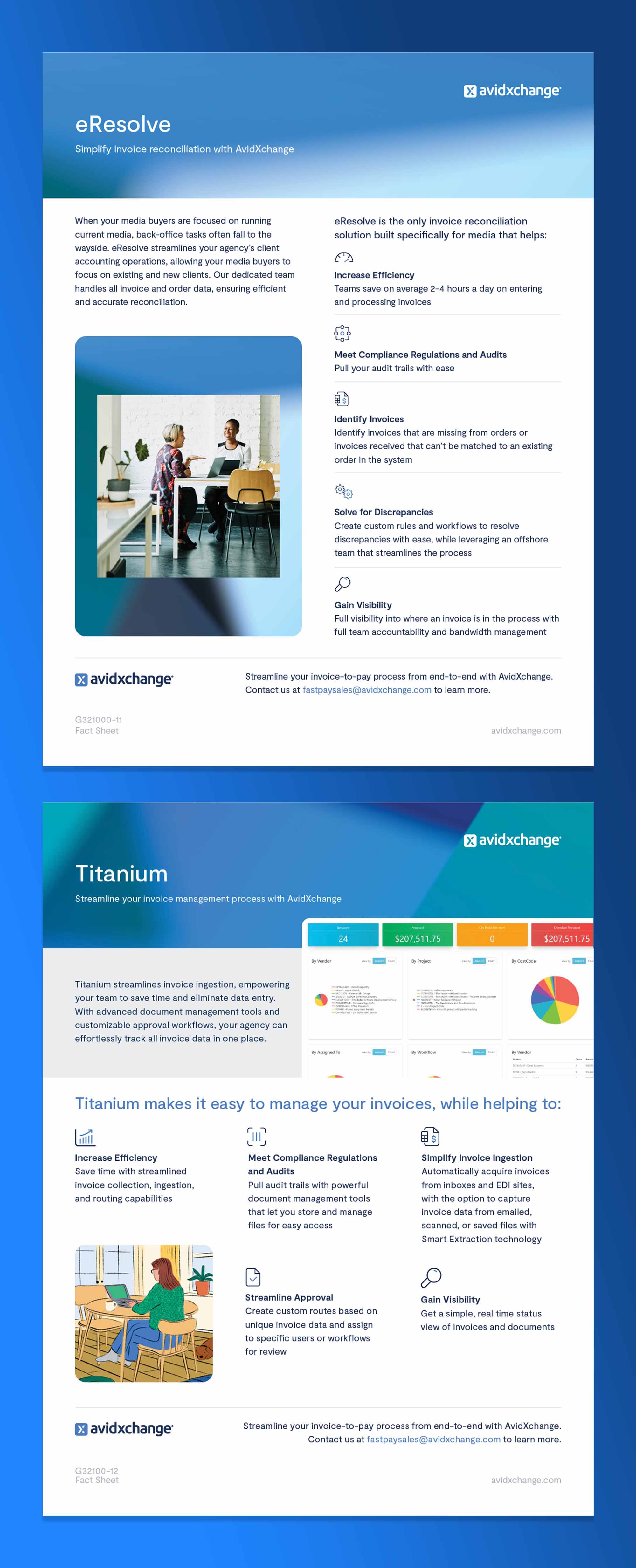 I joined the FinTech company FastPay just after it was acquired by AvidXchange. I was brought in to update all print collateral to the new AvidXchange brand style. Working with the existing copy of these documents, I updated the layouts and designs of these documents to reflect the new colors, fonts, and icons of the AvixExchange design system.