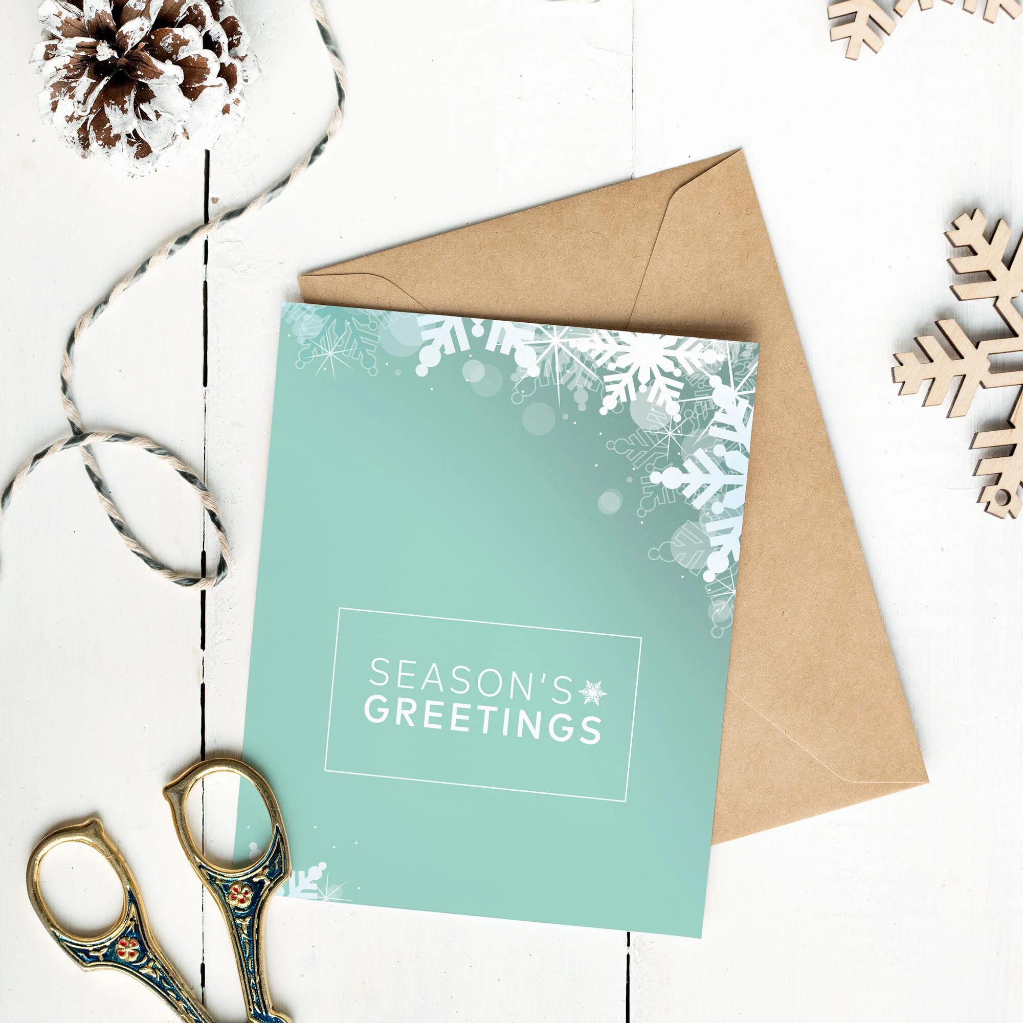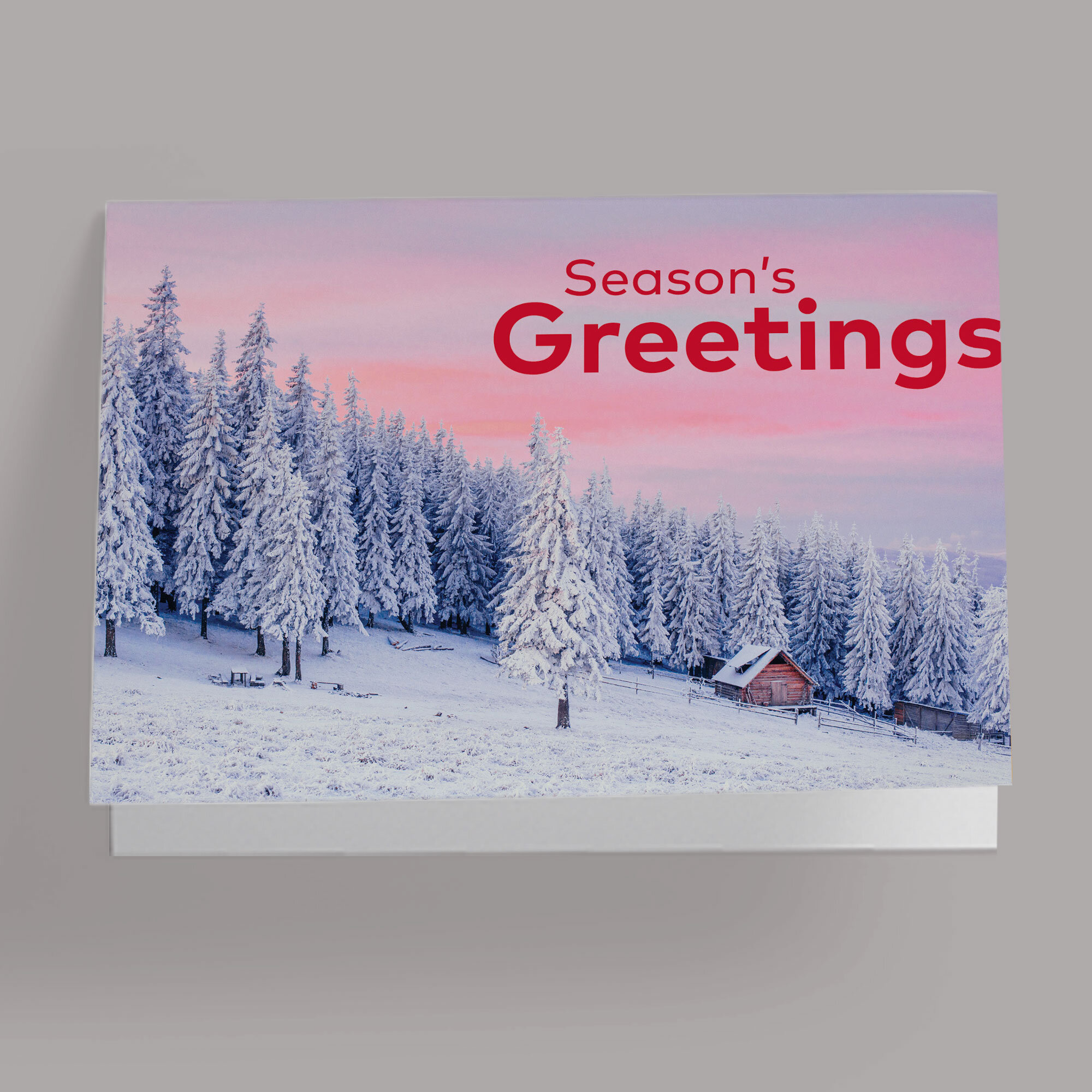 I like blue (in this case turquoise) for holiday cards because it’s a winter color without a tie to a specific holiday. I wanted to create another illustrated card that wasn’t as much of a visual punch. I still wanted to keep the interior from being a glaring white page, but for this one I used an illustration with depth and nuance. The Canadian team chose this card and required layouts in both English and French.