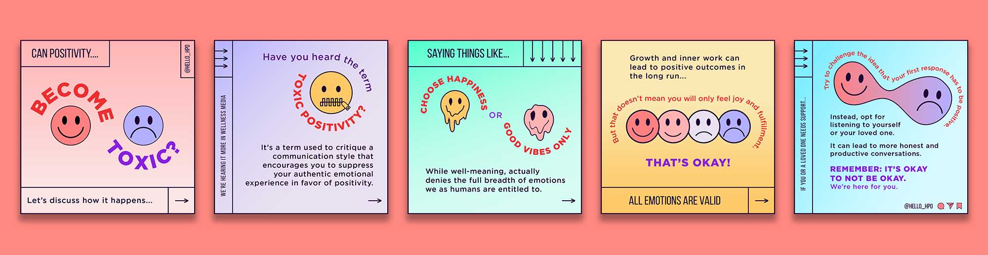 For this post, I found inspiration in the "don't worry, be happy" smiley face and hippie culture. I likened toxic positivity to a bad acid trip, intentionally choosing melting images and circular type treatments to contrast the structured framing device.