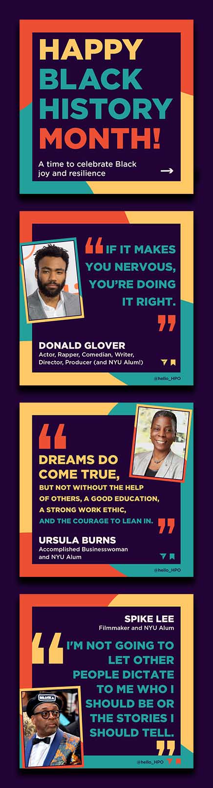 These were separate posts published over February 2022. I used the existing NYU HPO color palette to align as clossely as possible with the colors for Black History Month. again, I contrasted fluid shapes with a structured bounding box. Though the result is a more subdued color palette than usual, the post successfully feels on-brand for both NYU HPO and Black History Month.