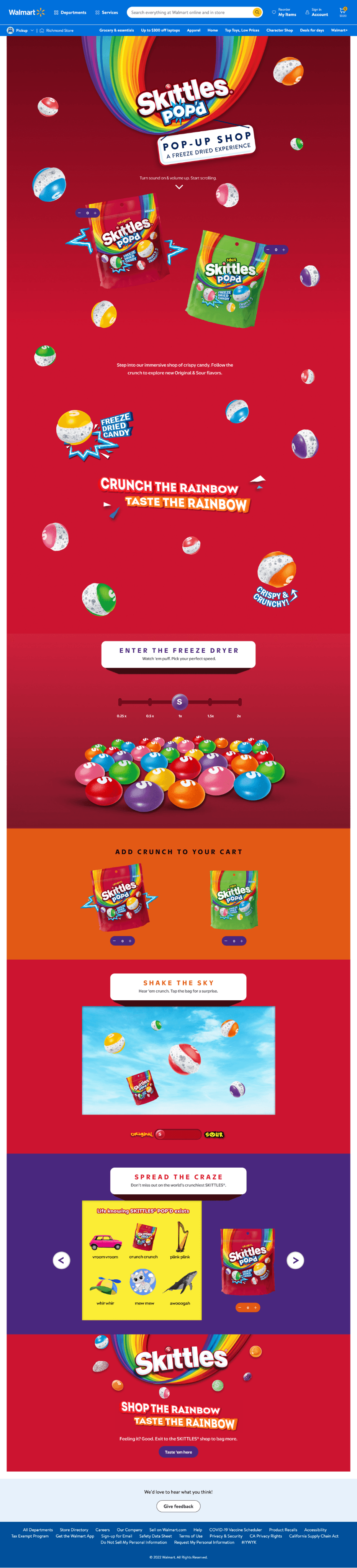 Our team developed a series of mini games/interactions for a shoppable brand page on the Walmart website. Each interaction would hit on one of the three key components requested by Mars: